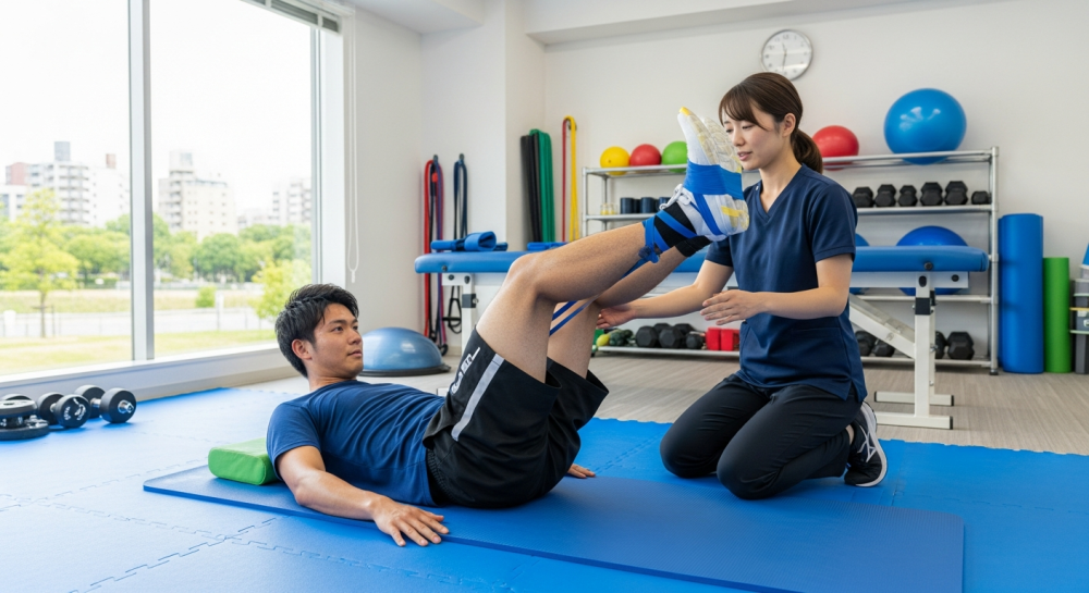 👉関節可動域を維持しながら、フォーム修正と荷重バランスの再構築を行う。