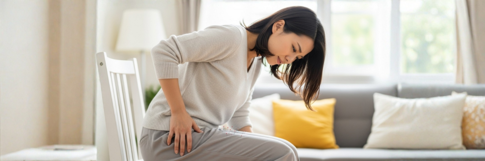 靴下を履いたり、、物を拾うような前かがみになる動作や、デスクワーク、運転などの長時間座る姿勢、あとは朝起き上がた後に症状が出やすいケースもあります。